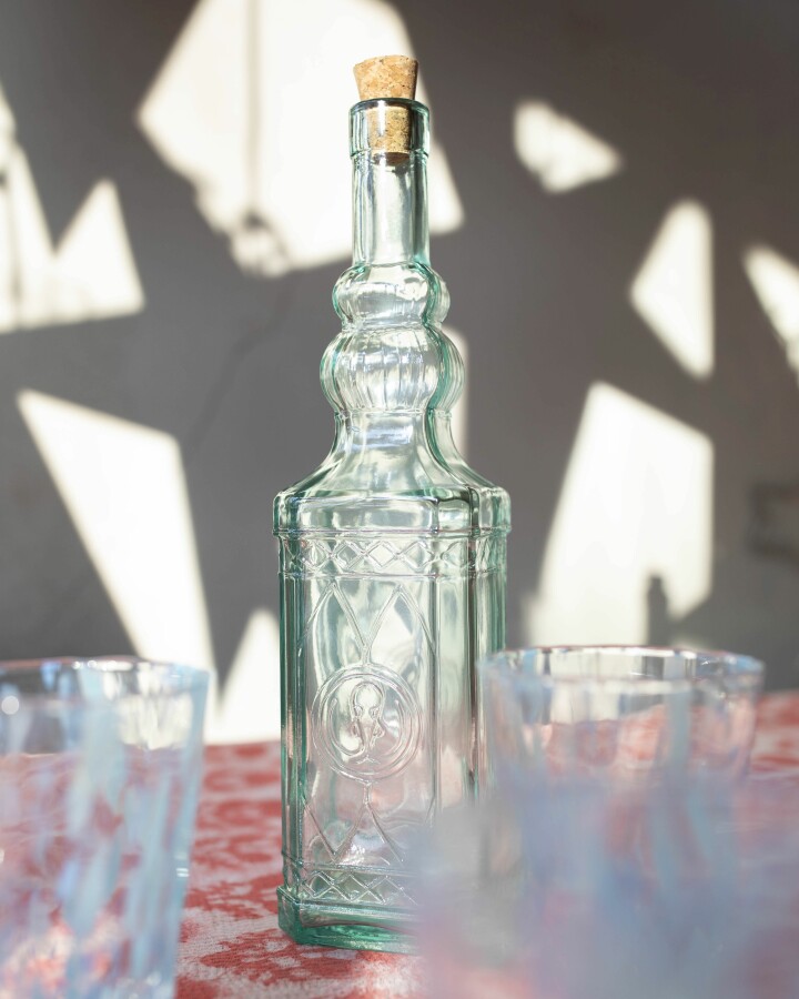 Diese spanische Flasche ist elegant in ihrer Schlichtheit. Das blaue Glas reflektiert das Sonnenlicht wunderschön und bringt die Wärme Galiciens in Ihre Küche. Ein gewöhnlicher Gegenstand, der zu einem schönen Kunstwerk erhoben wurde. Füllen Sie die Flaschen mit Olivenöl, Essig oder einfach nur Wasser und verschließen Sie sie mit einem Flaschenverschluss. Stellen Sie ein paar Flaschen zusammen, um Ihr Haus zu dekorieren; Fülle schafft Pracht!
