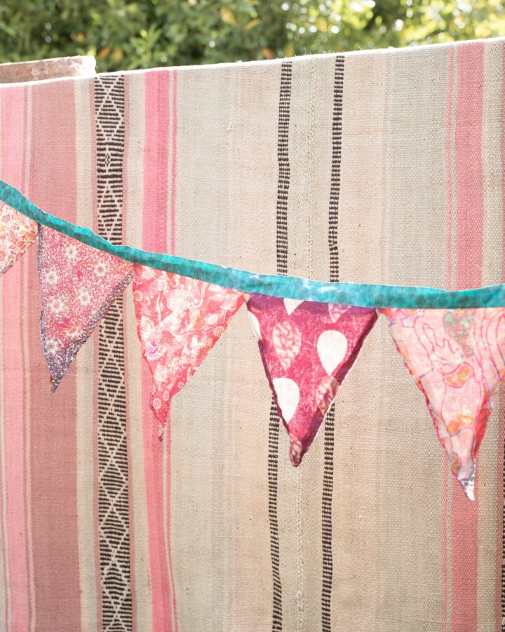 Our garlands are a fusion of leftover material of sari production and of recycled saris worn by Indian women from West Bengal. All these beautiful small silky pieces are now being given another life. They are made into a splendid patchwork of vintage designs. Sustainable enjoyment: say bye-bye to plastic balloons and other single-use party decorations!