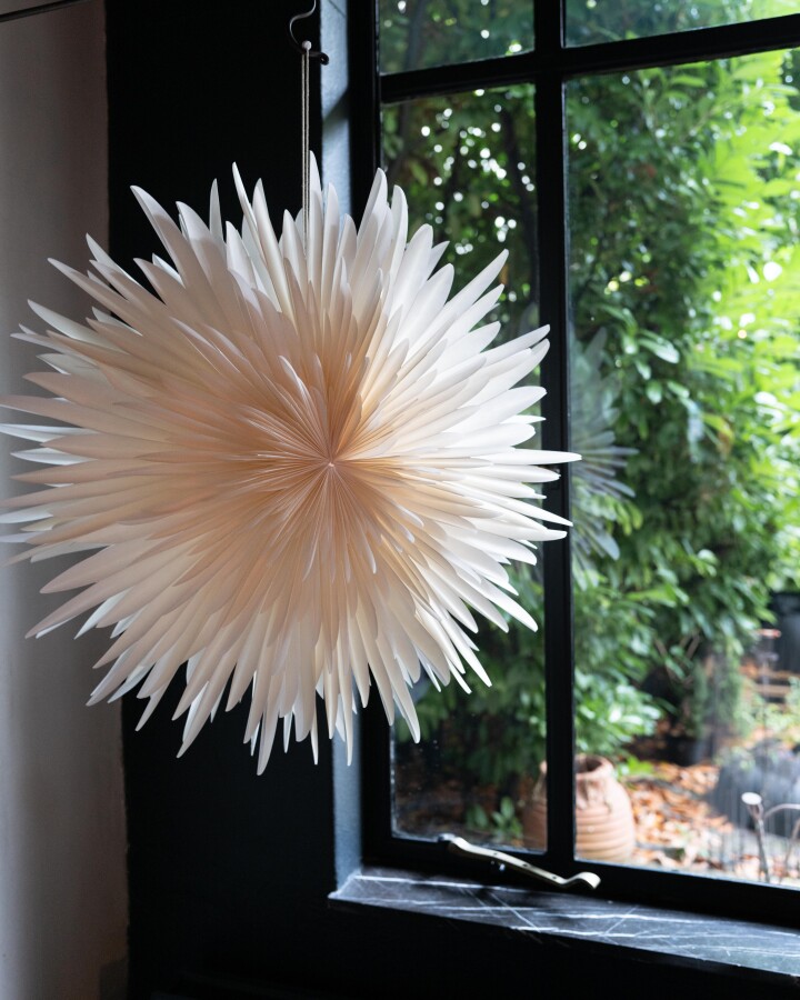 Unfold the points of the stars easily by placing your hand in each point and to spread your fingers gently afterwards. Packed in an envelope and therefore easy to send by mail. The electric cord and LED light bulb to complete the star, are available too.